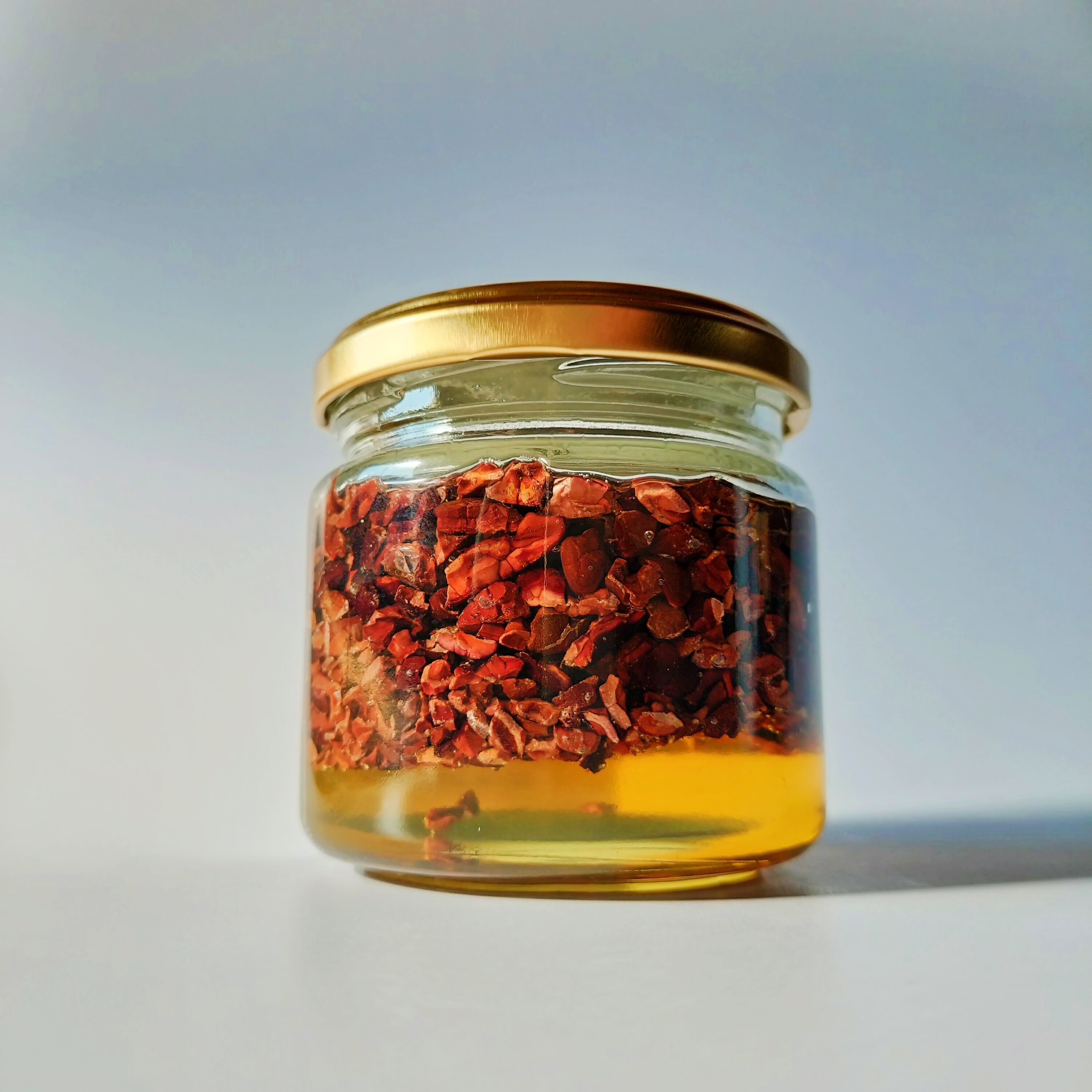 香ばしいガーナ産カカオニブを地元・茨城県土浦産の蜂蜜に漬けこみました。